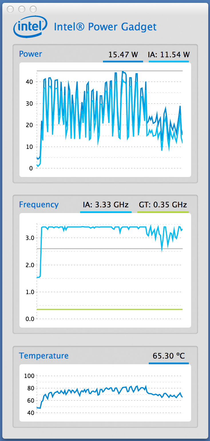 I’m sure you’ve had that thought ‘This pc used to be faster’. I used to put it down to the number of installed operating system patches and other software etc, however now my first port of call is always going to be boot up the Intel Power Gadget (also available on PC) and check that the machine is operating at the expected frequency. If not open up the machine, and clean the cooling system.